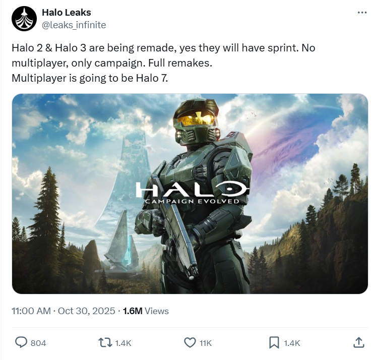 Leaks_Infinite stated “Halo 2 & Halo 3 are being remade, yes they will have sprint. No multiplayer, only campaign. Full remakes. Multiplayer is going to be Halo 7.” This is, admittedly, not much to go on, but the prospect of a full remake of Halo 3 fills my mind with imagination.